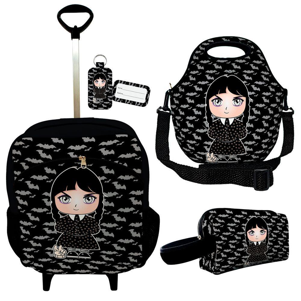 Kit Mochila Escolar Infantil Rodinhas Lancheira Estojo Isoprene Menina Addams
