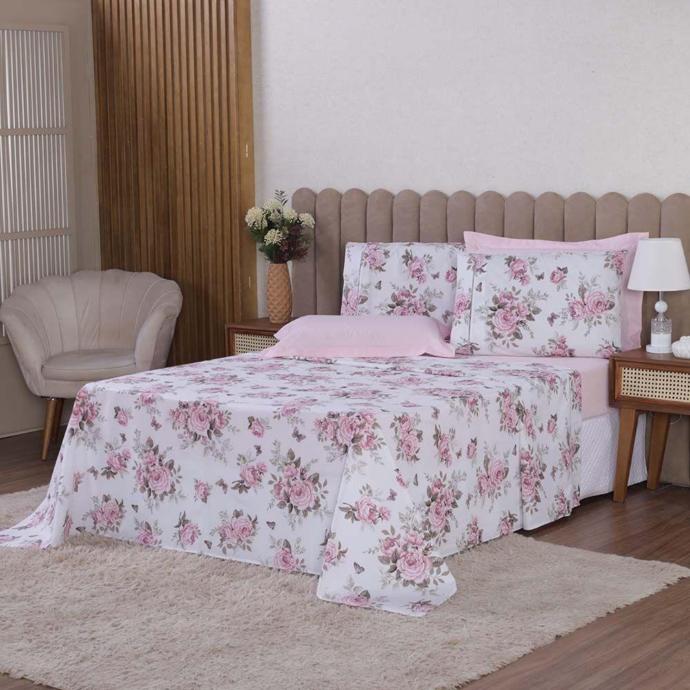 Jogo De Lençol Beatriz Solteiro 3 Peças Percal 180 Fios 100% Algodão Ponto Palito - Rosa Floral