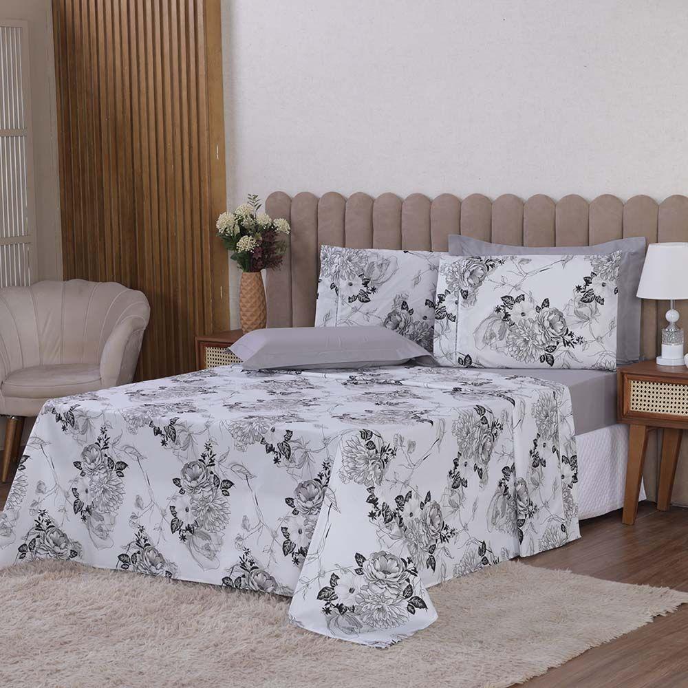 Jogo De Lençol Beatriz Casal 4 Peças Percal 180 Fios 100% Algodão Ponto Palito - Cinza Floral