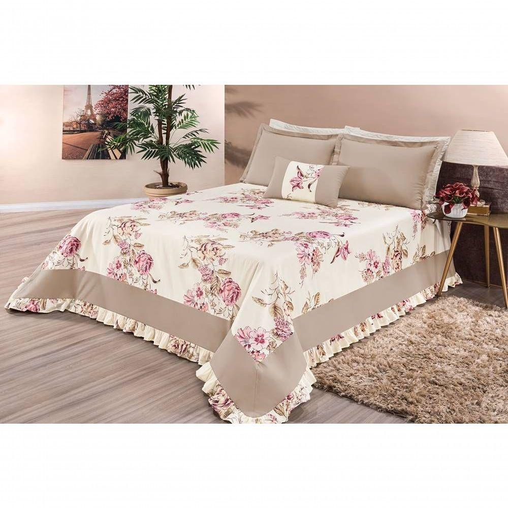 Kit Cobre Leito Colcha Belle Queen Estampado Dupla Face 400 Fios 3 Peças Floral Rosê