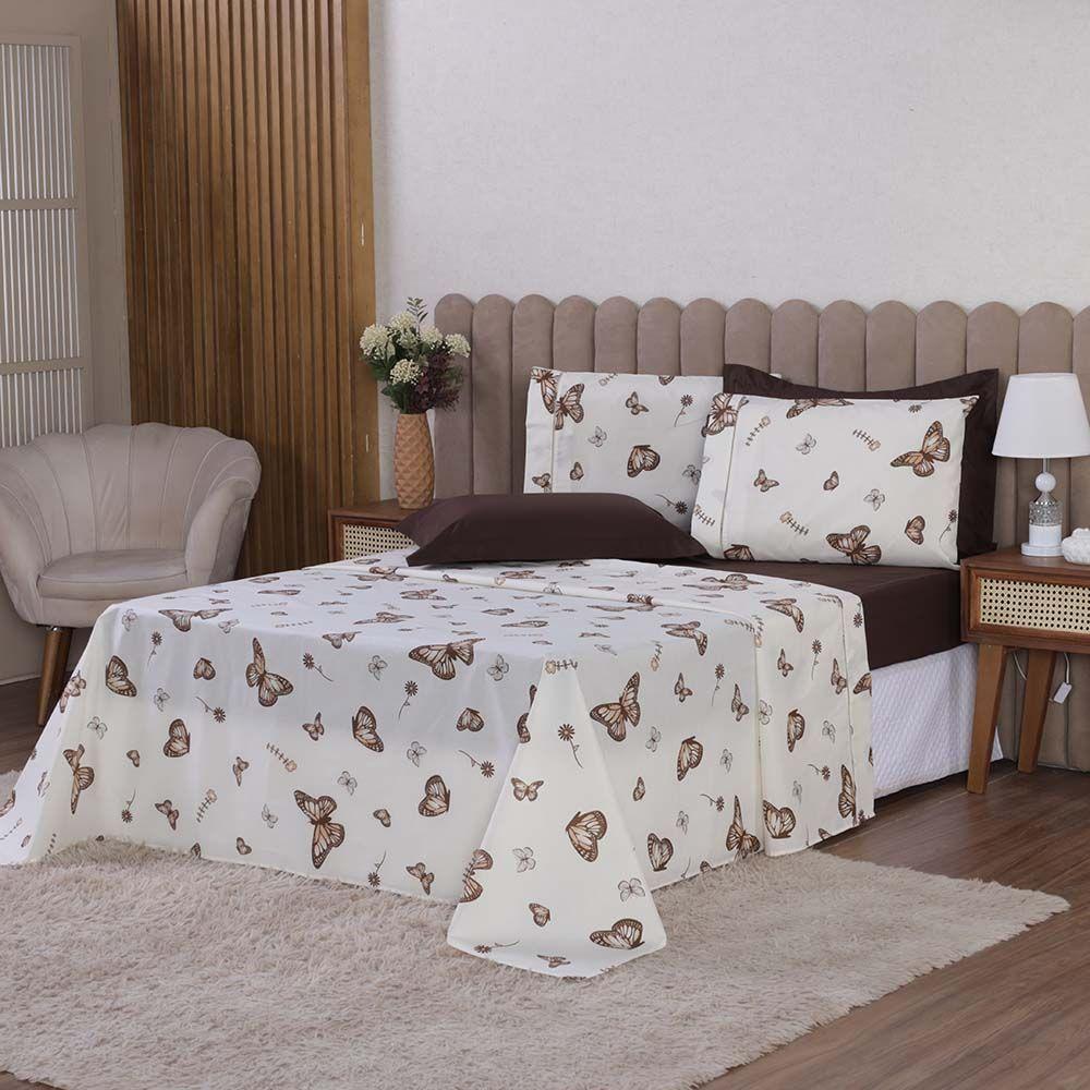 Jogo De Lençol Beatriz Queen 4 Peças Percal 180 Fios 100% Algodão Ponto Palito - Marrom Borboleta