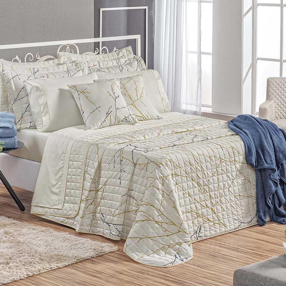 Kit Cobre Leito Colcha Lislie Queen 3 Peças Percal 300 Fios Dupla Face Estampado - Ramo Damasco - 100% Poliéster