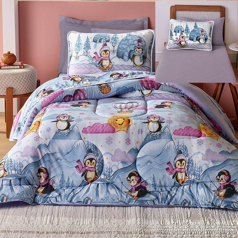 Kit Coordenado Edredom Com Lençol Solteiro Mymo - Pinguim - 100% Algodão