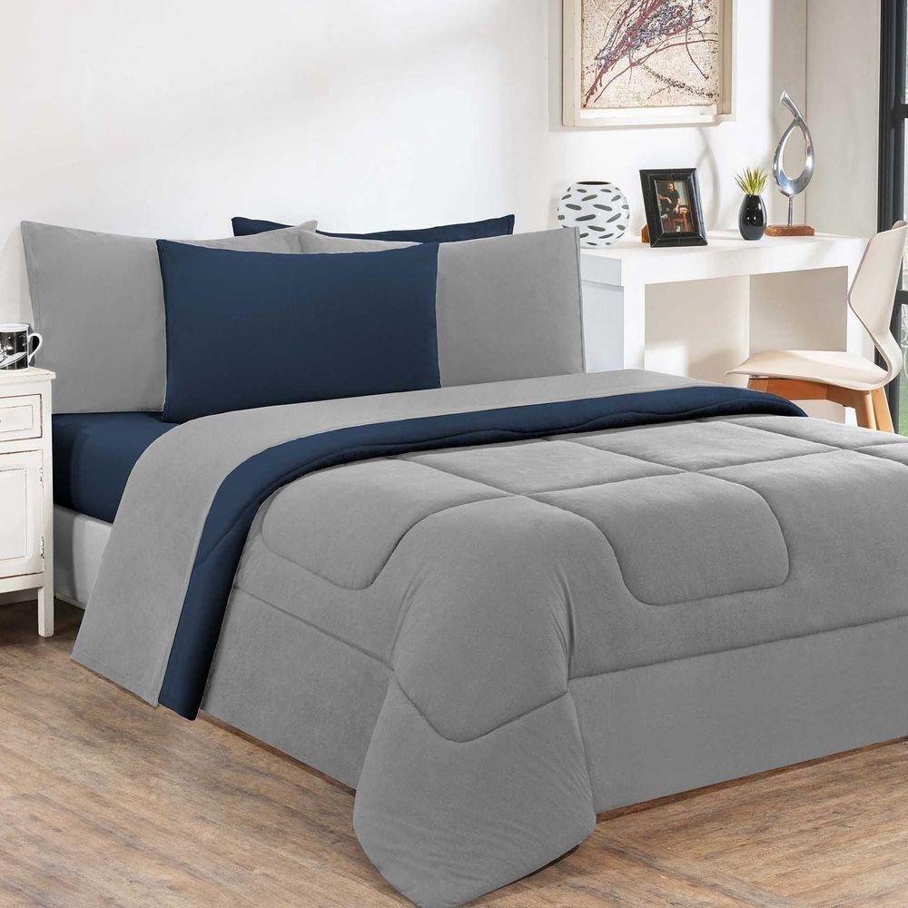 Kit Edredom + Jogo De Lençol Malha 100% Algodão Gran Moratta 6 Peças King - Cinza-azul Marinho