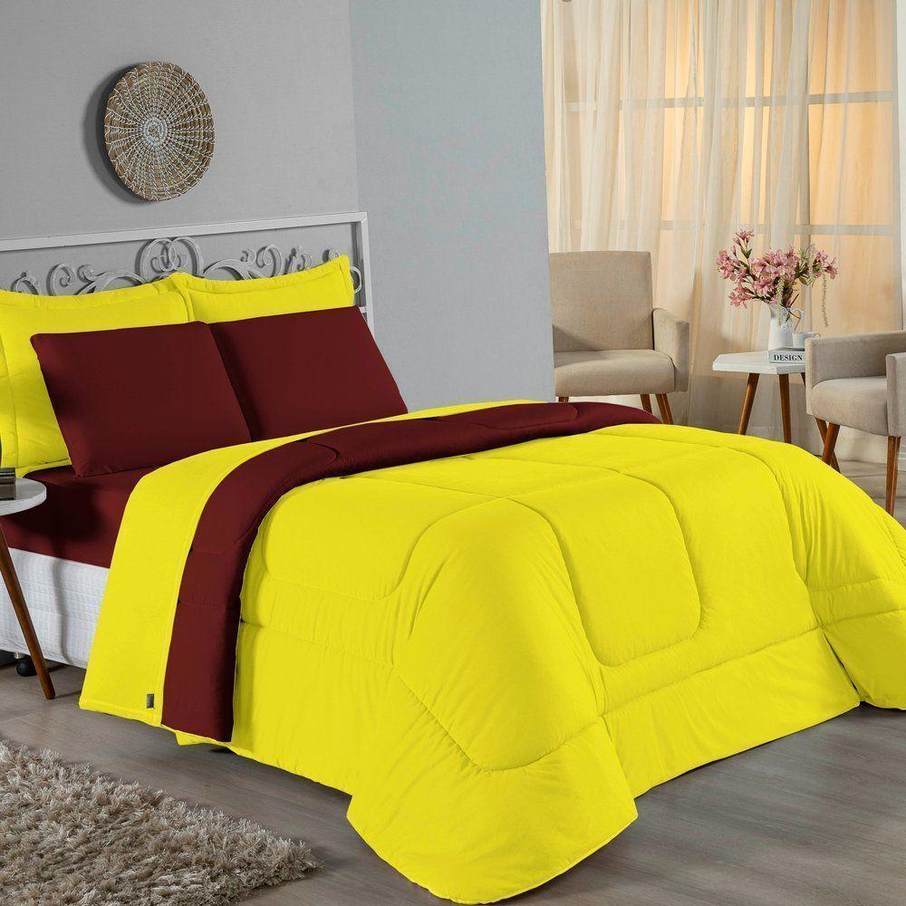 Kit Edredom Dupla Face + Jogo De Lençol Casal Viúva Nobre 7 Peças Malha 100% Algodão - Amarelo / Vinho
