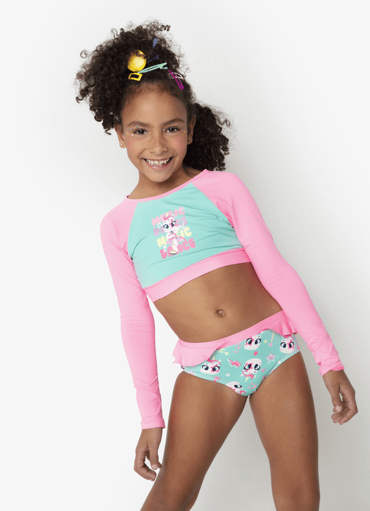 Conjunto Cropped e Calcinha com Proteção Solar Menina Unicórnio Skate