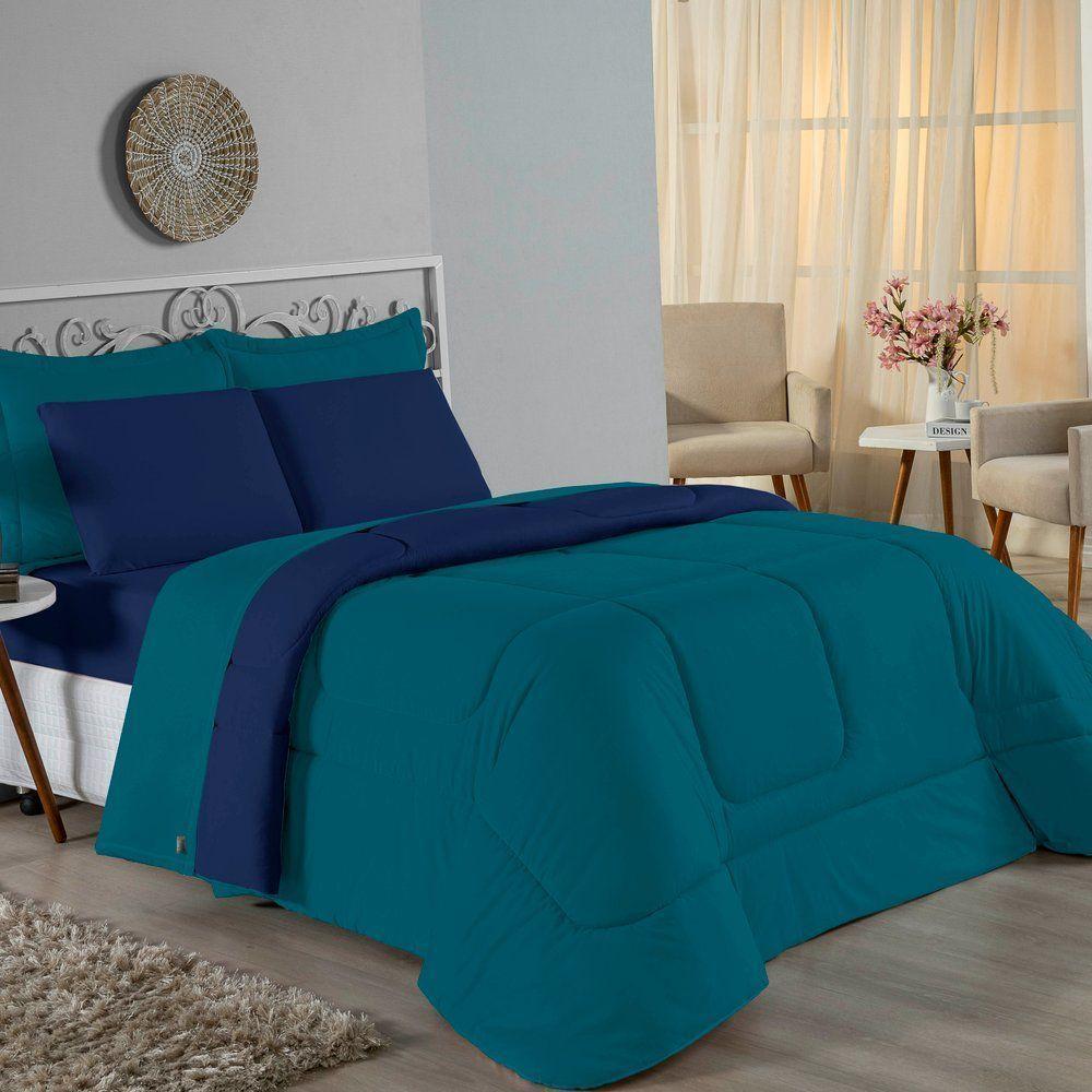 Kit Edredom Dupla Face + Jogo De Lençol Casal Nobre 6 Peças Malha 100% Algodão - Azul-marinho / Turquesa