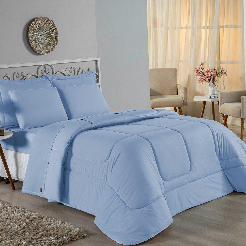 Kit Edredom Dupla Face + Jogo De Lençol Casal Nobre 6 Peças Malha 100% Algodão - Azul-bebê