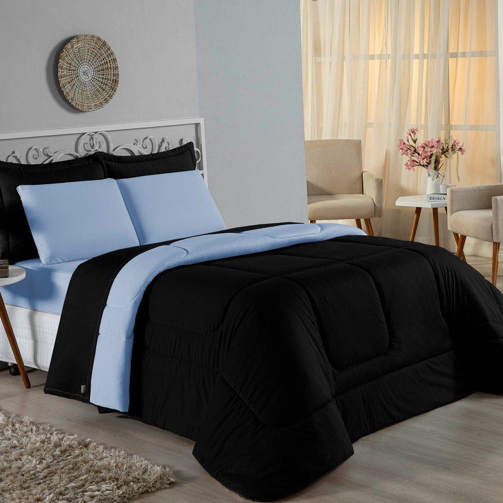 Kit Edredom Dupla Face + Jogo De Lençol Casal Nobre 6 Peças Malha 100% Algodão - Preto / Azul-bebê