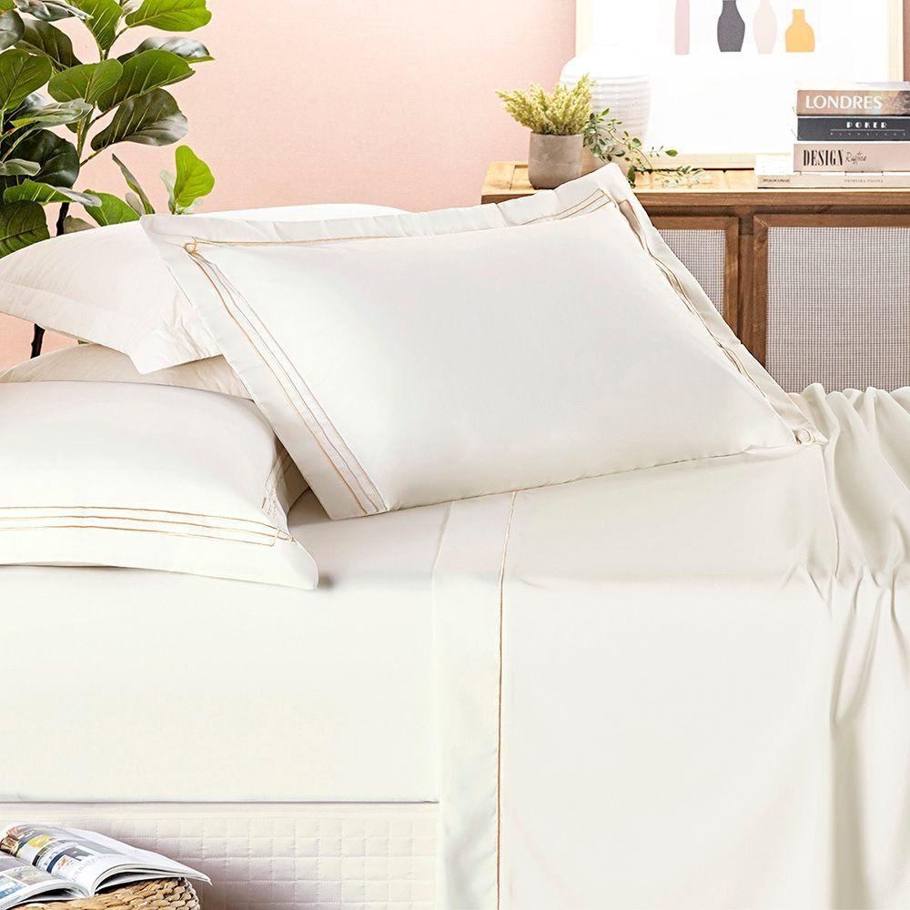 Jogo Cama Lençol Trivio Casal 400 Fios Bordado Fronhas Aba Americana 4 Peças Bege