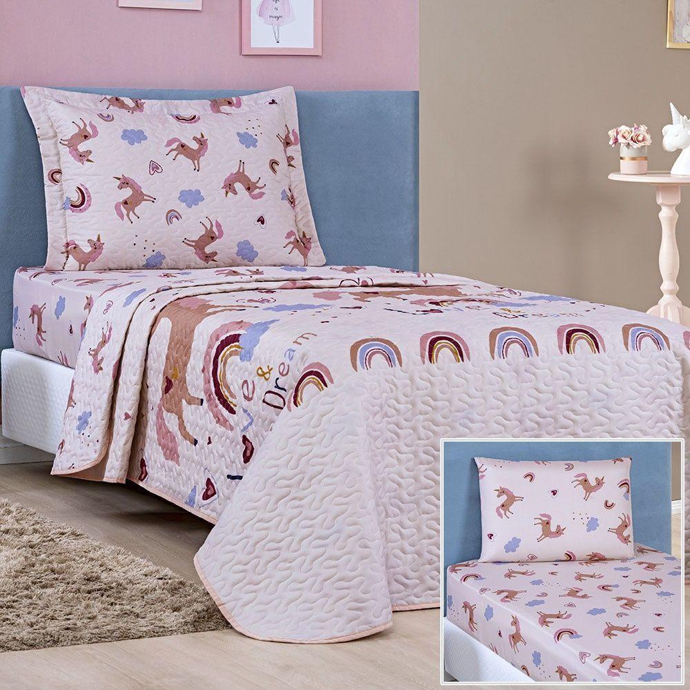 Enxoval Kit Colcha + Jogo De Cama Lençol Bouti Solteiro Infantil Kids 4 Peças 100% Poliéster - Unicórnio