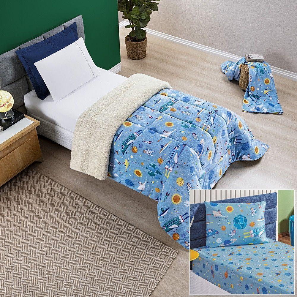 Kit Coberdrom + Jogo De Cama Bouti Kids Solteiro 03 Peças 100% Poliéster - Astronauta