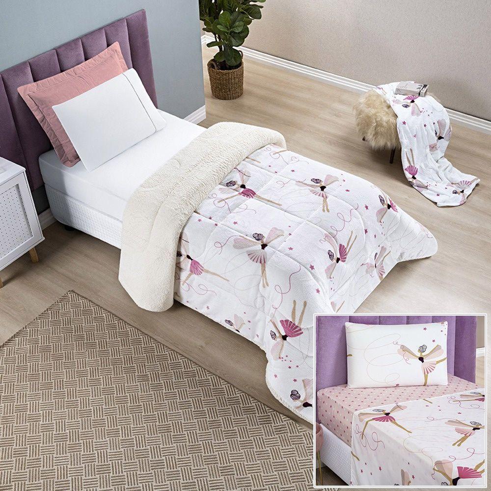 Kit Coberdrom + Jogo De Cama Bouti Kids Solteiro 04 Peças 100% Poliéster - Bailarina