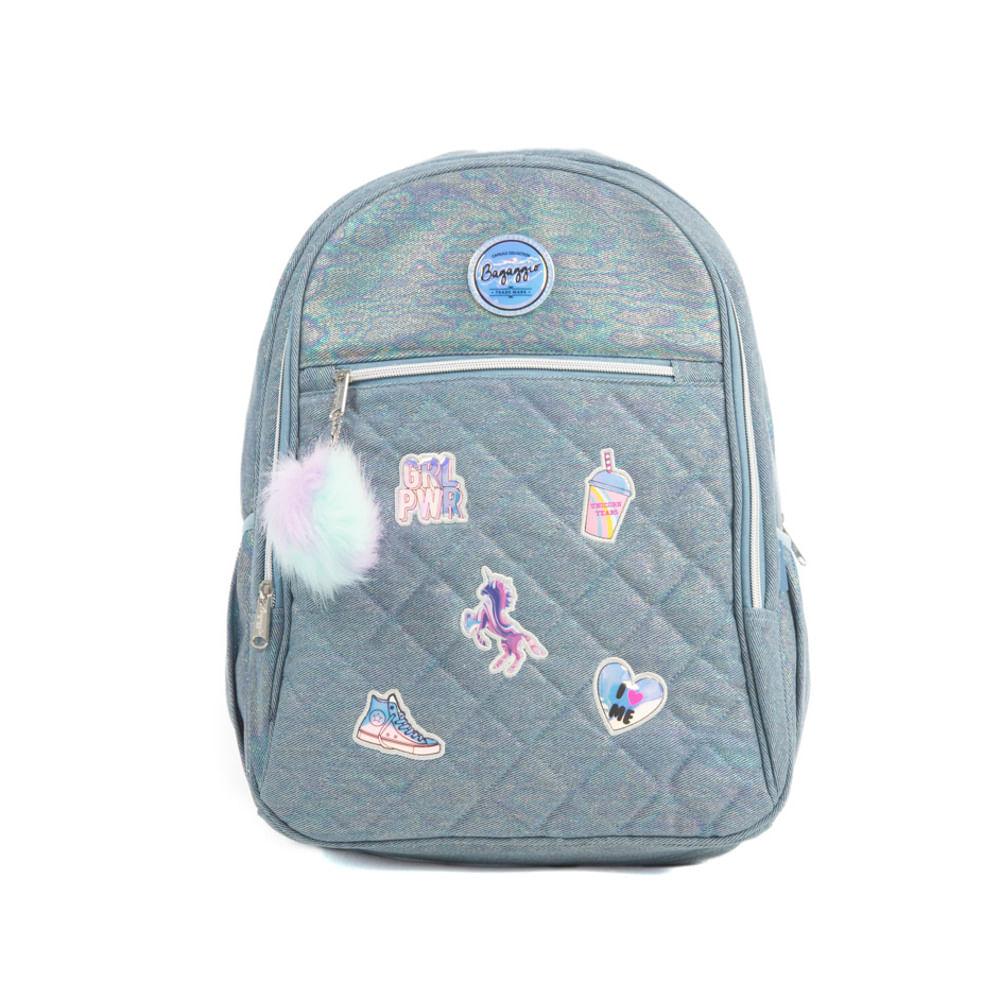 Mochila Escolar Feminina Matelasse Jeans Patches Azul
