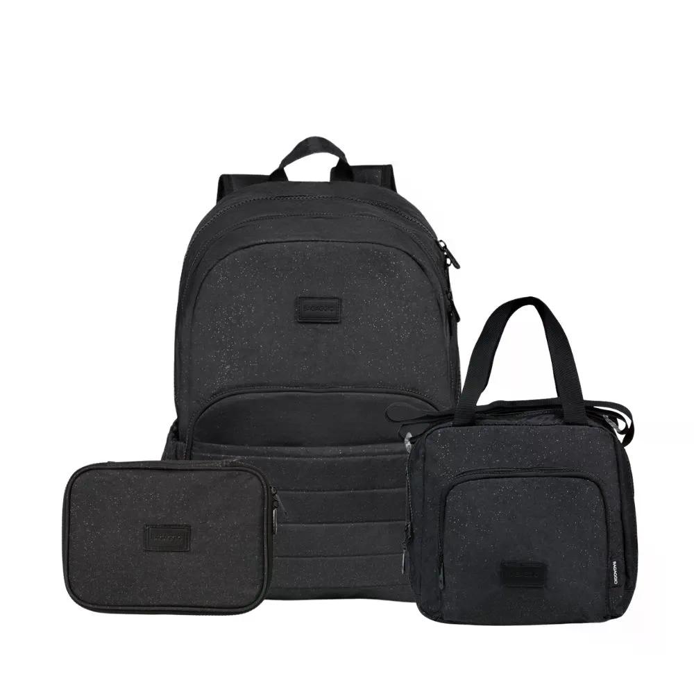 Kit Mochila + Lancheira + Estojo Crinkle Glitter Preta
