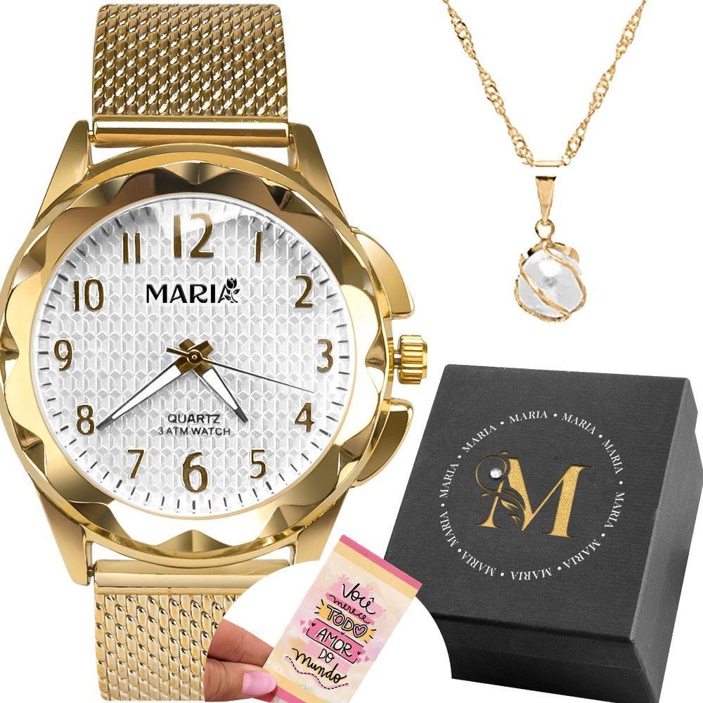 Relogio Aço Inox Banhado Feminino + Caixa + Colar Perola Perola Cartão Presente Silicone Prova Dagua
