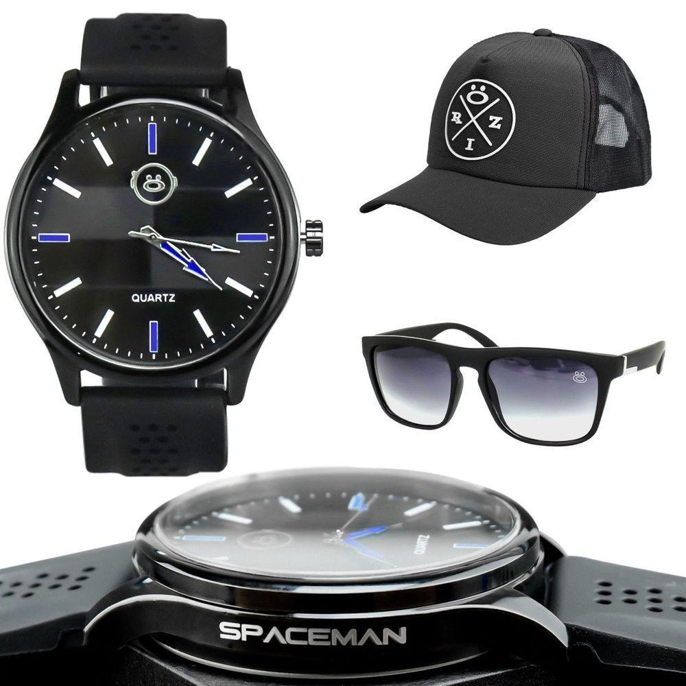 Relógio Masculino Aço Preto + Oculos Proteção Uv + Bone Presente Pulseira Ajustável Preto Social