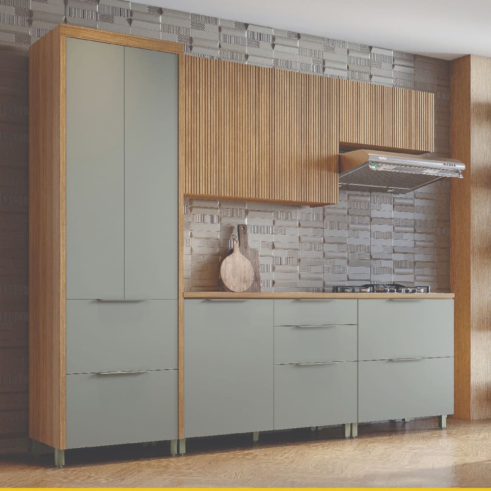Cozinha Completa em MDF Nesher Paris Ripada com 270 cm de Largura, 7 Portas, 6 Gavetas e 11 Prateleiras - Verde/Nature