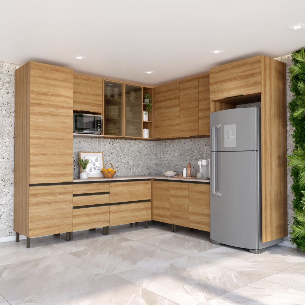 Cozinha Bartira Cristal com 14 Portas, 3 Gavetas, 13 Prateleiras e Nicho para Micro-ondas - 301,8cm de Largura
