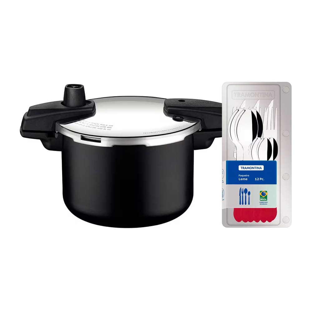 Panela de Pressão Tramontina Arizona em Alumínio, Revestimento Starflon Max 4,5L – Preto + Faqueiro 12 Peças Leme com Lâminas em Aço Inox - Vermelho