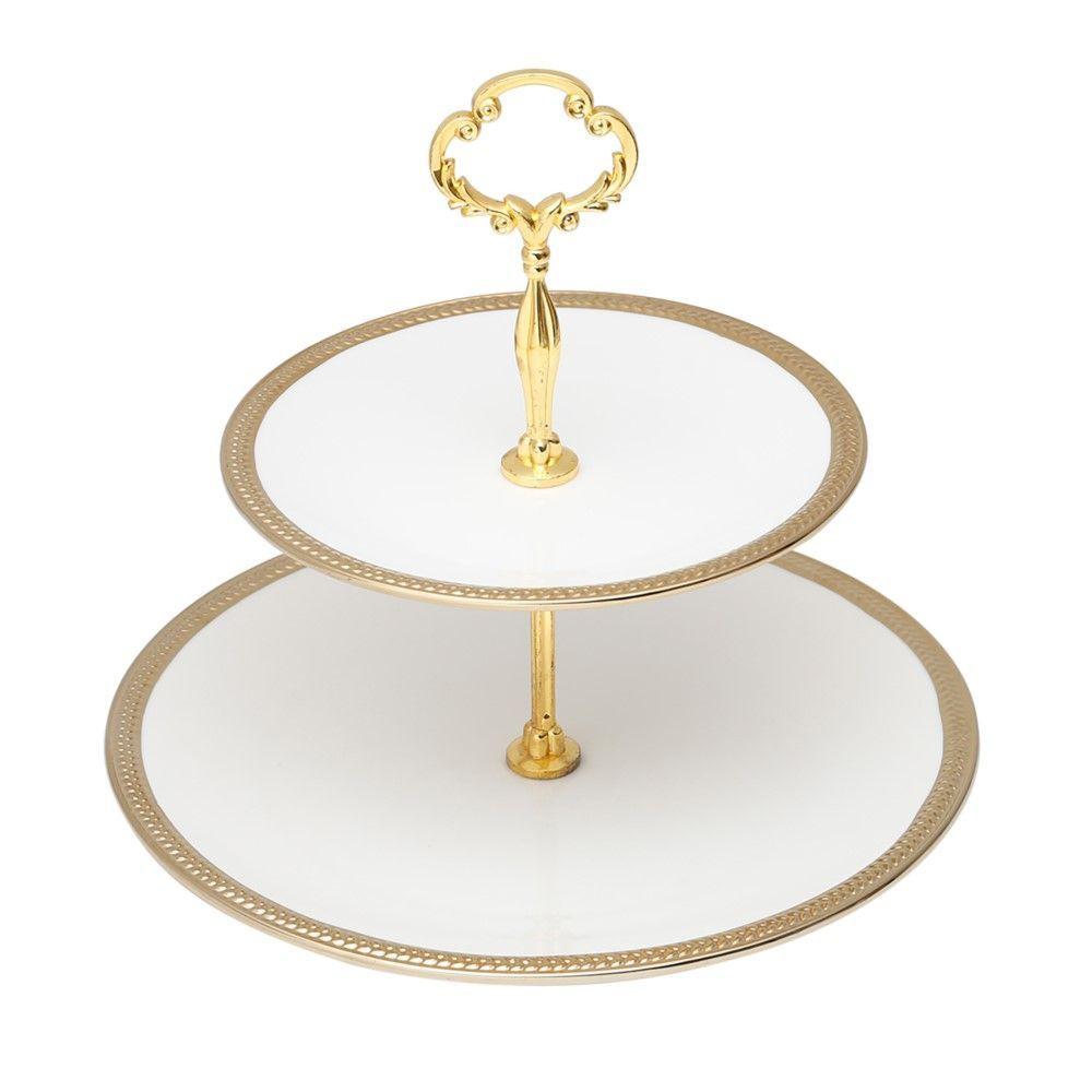 Porta Doces De Porcelana 2 Andares Paddy Branco E Dourado 19/27 X 24 Cm Wolff