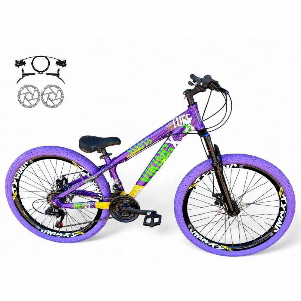 Bicicleta Aro 26 Vikingx Tuff Freio Hidráulico 21v Freeride Rodas Vmaxx Suspensão Pneu Flame Roxo-amarelo-Verde X25