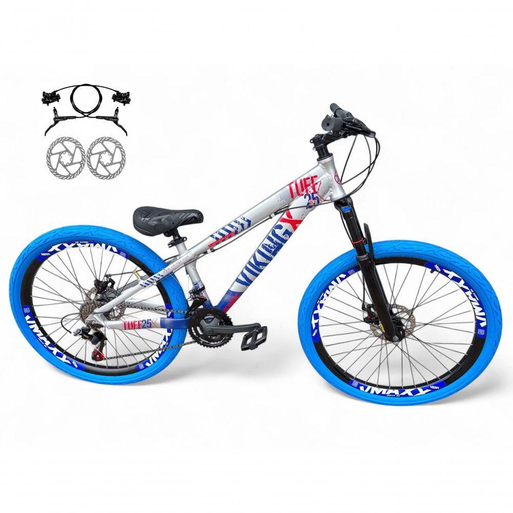 Bicicleta Aro 26 Vikingx Tuff Freio Hidráulico 21v Freeride Rodas Vmaxx Suspensão Pneu Flame prata-Azul X25