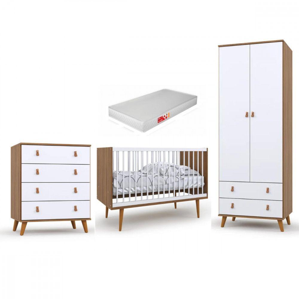 Berço Americano E Cômoda Gaveteiro New Classic Branco Com Pés Madeira E Colchão Gazin - Reller
