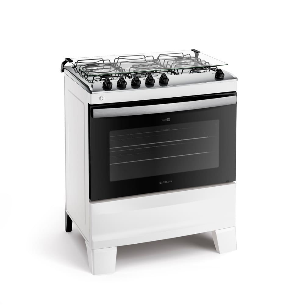 Fogão Atlas 5 Bocas Agile Up com Mesa de Inox, Grade Dupla no Forno e Acendimento automático Bivolt – Branco