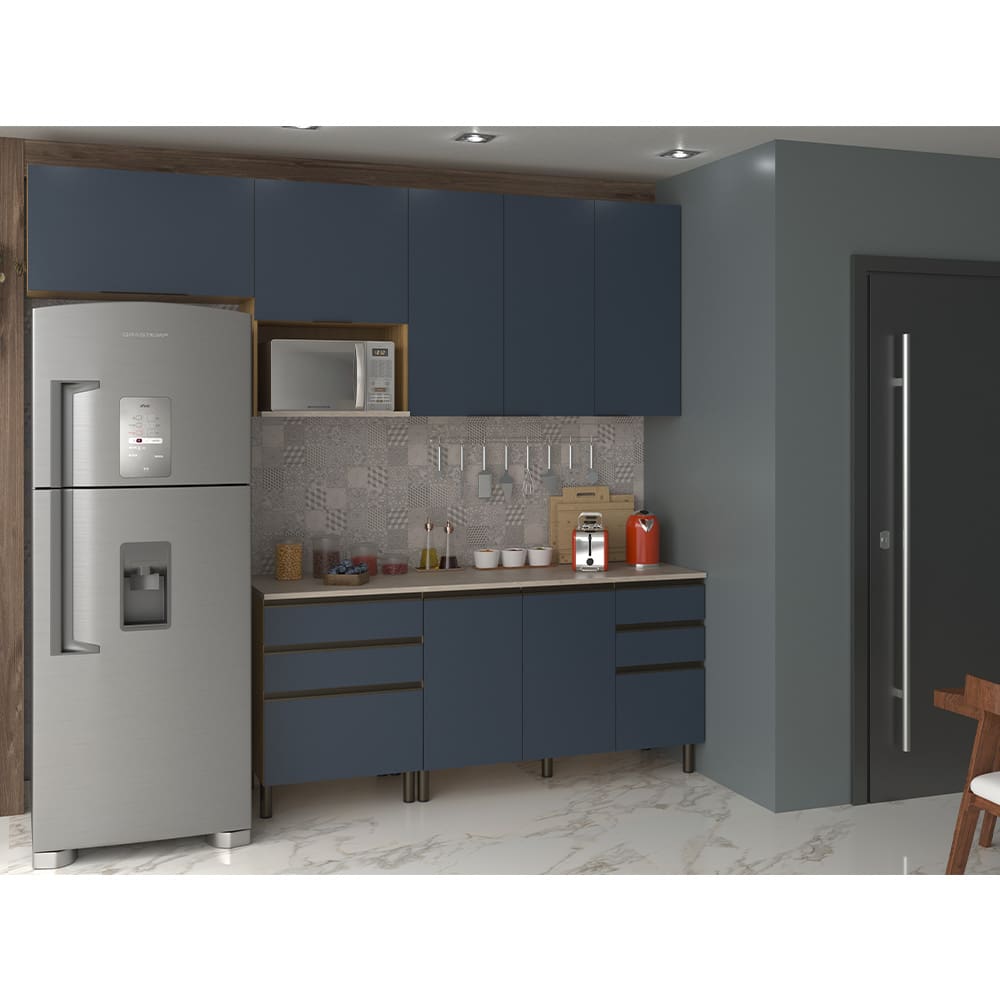 Cozinha Completa Bartira Cristal com 6 Portas, 5 Gavetas e 7 Prateleiras e 260cm de Largura - Lâmina de Mel/Azul Royal