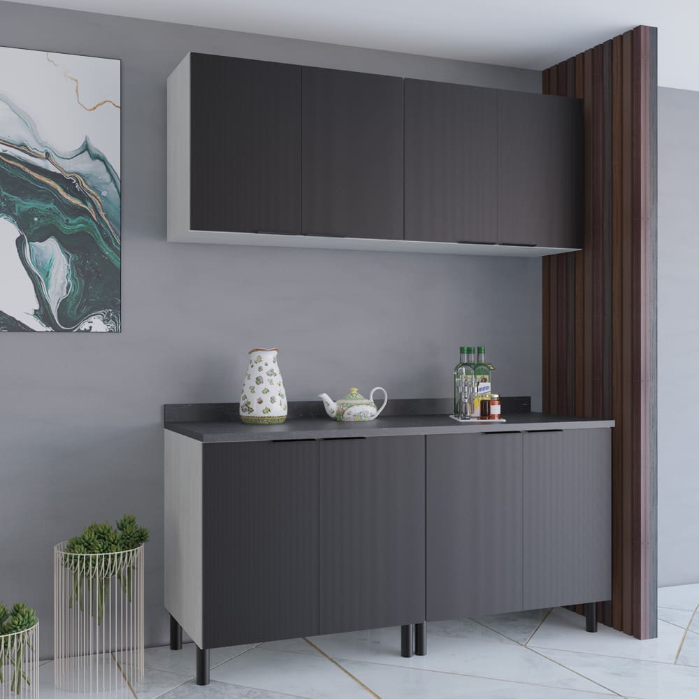 Cozinha Compacta Bartira Rubi com 8 Portas, Balcão Duplo Freixo/Preto Poah - 160cm largura