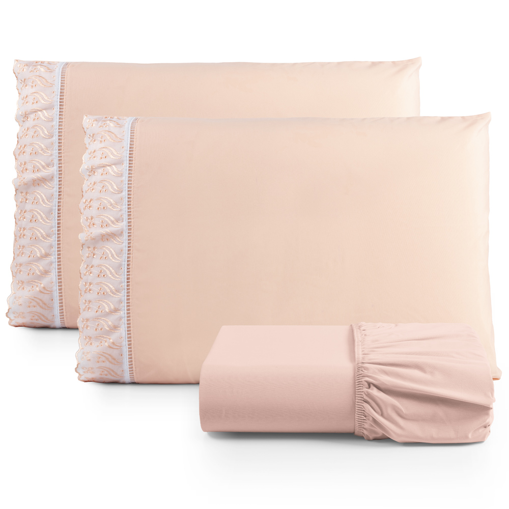 Jogo Cama Lençol Paris Casal Padrão Percal 180 Fios 100% Algodão Lese Bordada 3 Peças - Salmão