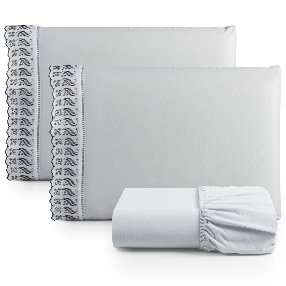 Jogo Cama Lençol Paris Casal Padrão Percal 180 Fios 100% Algodão Lese Bordada 3 Peças - Cinza