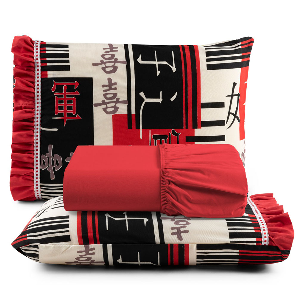 Jogo Cama Lençol Fiore Casal Padrão Estampado 180 Fios 100% Algodão com Babadinho 3 Peças Vermelho Oriental Japonês