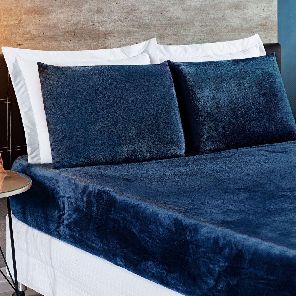 Jogo Cama Lençol BiaSoft Casal Padrão Manta Flannel Quente 3 Peças - Azul Marinho