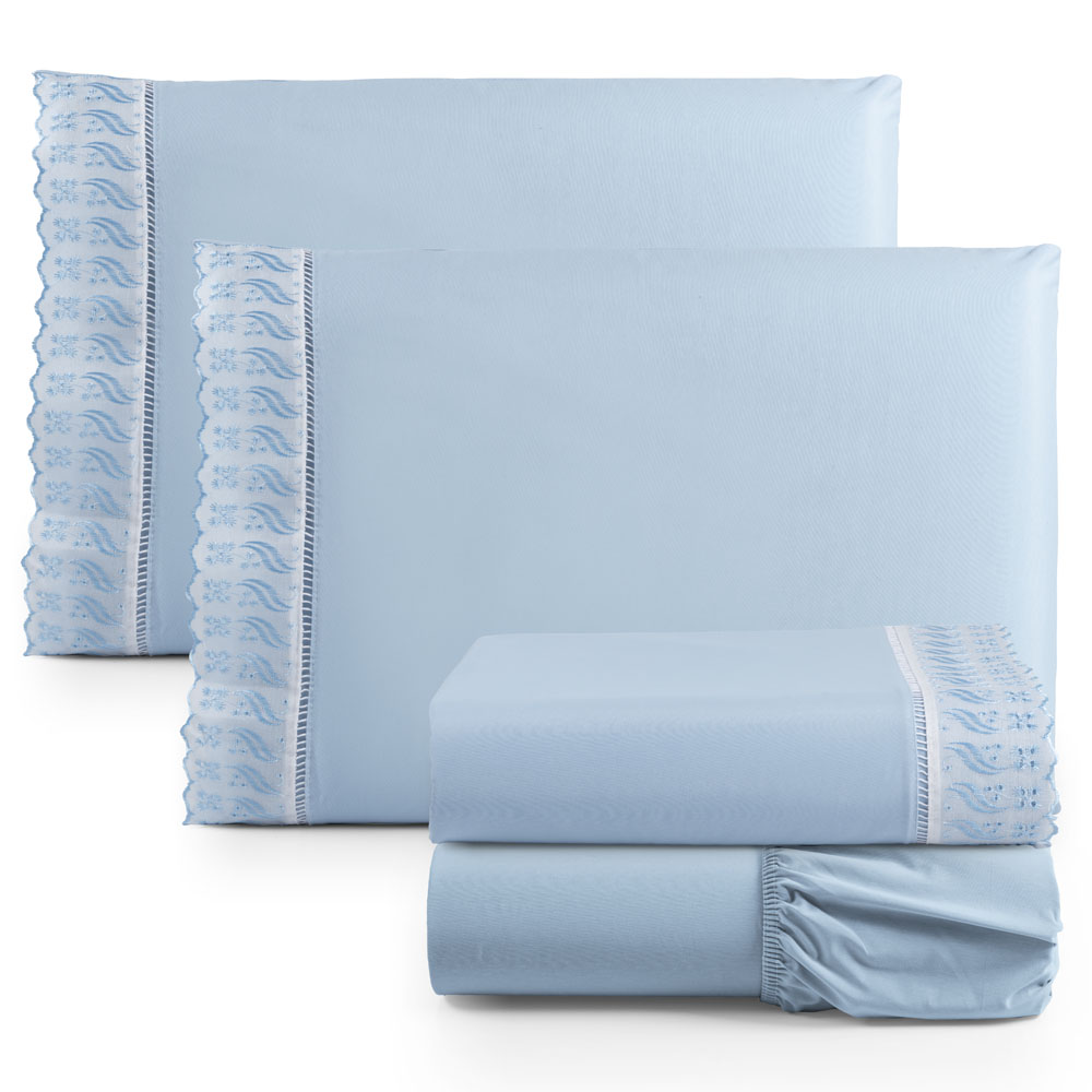 Jogo Cama Lençol Paris Casal Padrão Percal 180 Fios 100% Algodão Lese Bordada 4 Peças - Azul Claro