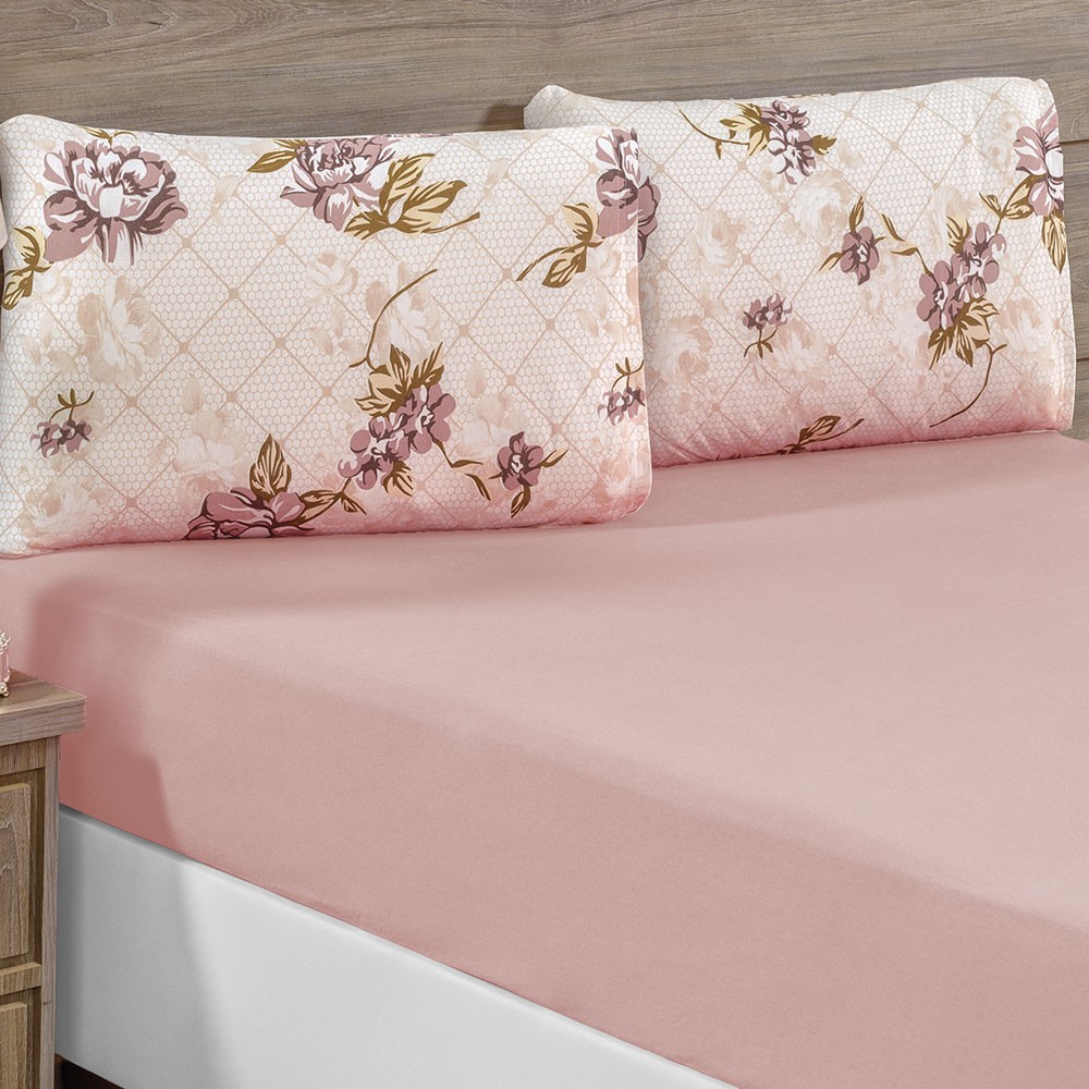 Jogo de Cama Lençol Siena Casal Malha Estampada Algodão 3 Peças - Rosê Florido