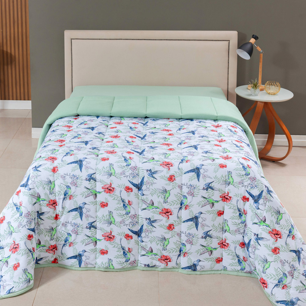 Edredom Cobertor Sonnet Solteiro Malha Estampada Dupla Face 100% Algodão - Beija Flor - Verde