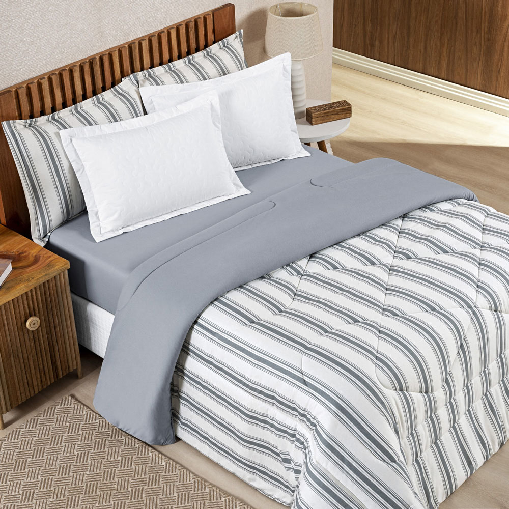 Edredom Cobertor Daily Queen Malha Listrado Dupla Face Fio Penteado - Cinza