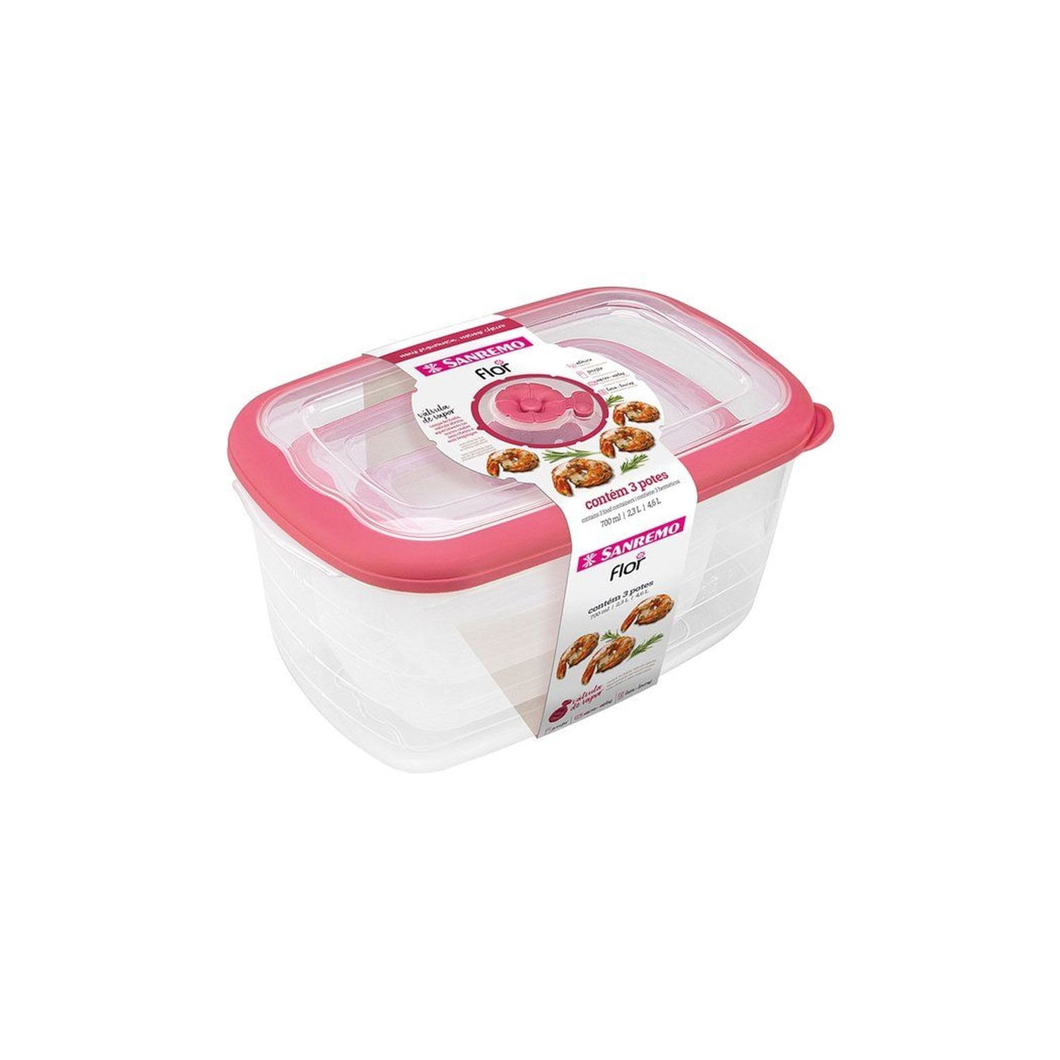 Conjunto de Potes Plásticos Retangulares Altos Herméticos Flor Rosa 3pçs - Sanremo