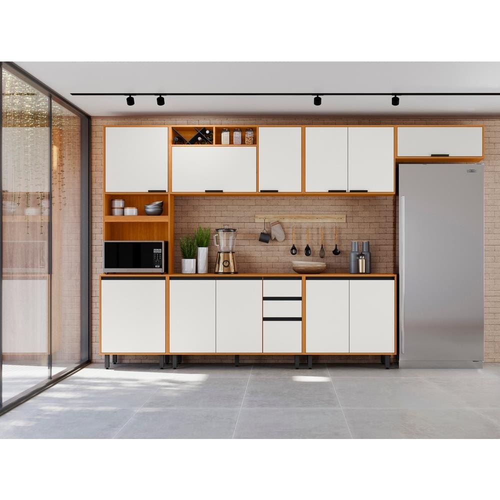 Cozinha Compacta Poliman Barcelona com 13 Portas, 2 Gavetas, 5 Prateleiras e Nicho para Micro-ondas - 258cm de largura