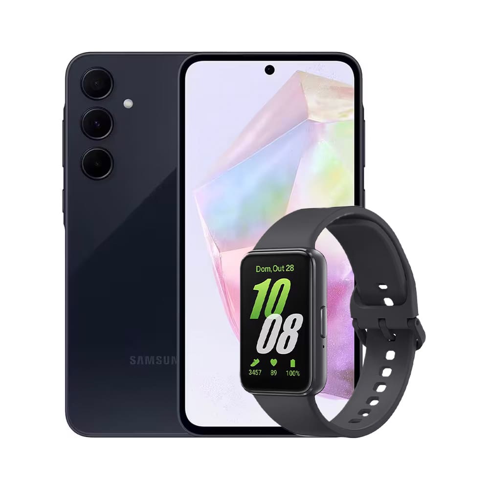 Smartphone Samsung Galaxy A35 5G Azul Escuro 128GB, 6GB RAM, Câmera Tripla Traseira de até 50MP e Tela Super AMOLED de 6,6” + Galaxy Fit3 Grafite