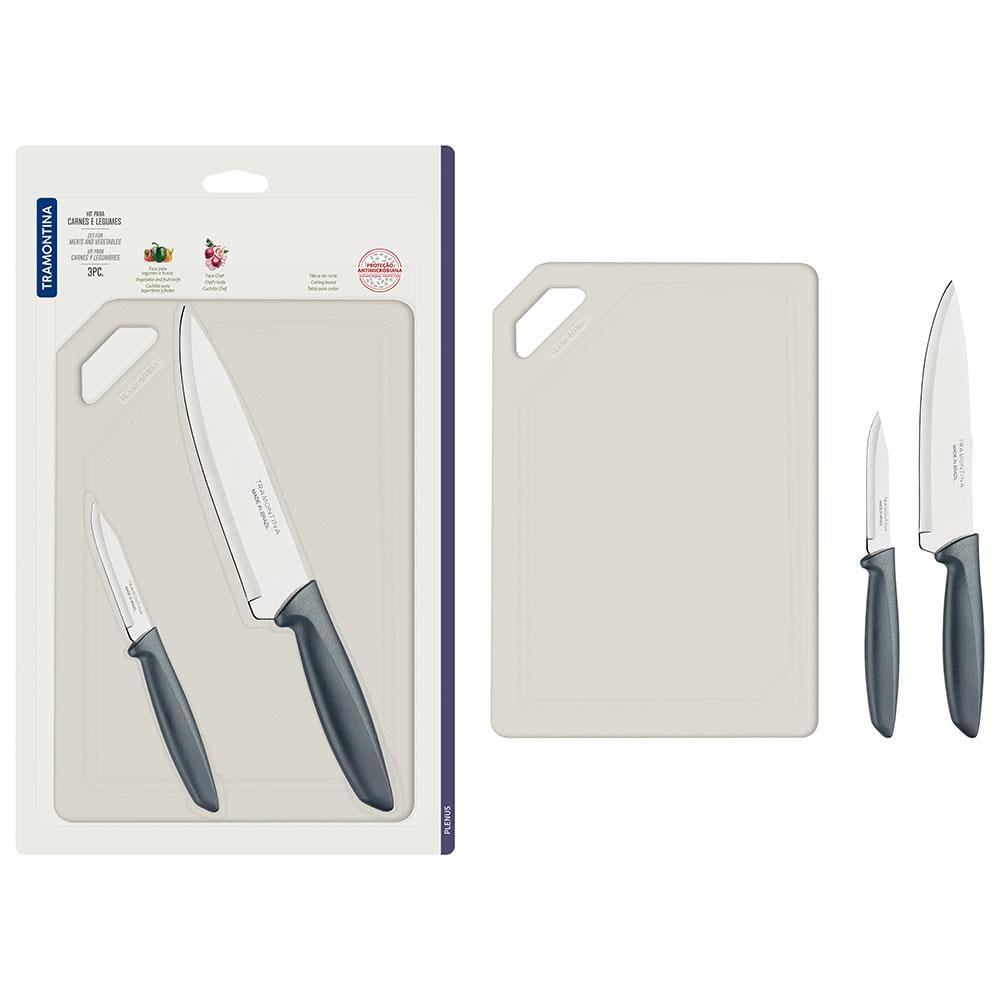 Conjunto de Facas e Tábua de Corte Tramontina Plenus em Aço Inoxidável - Cinza - 3 Peças
