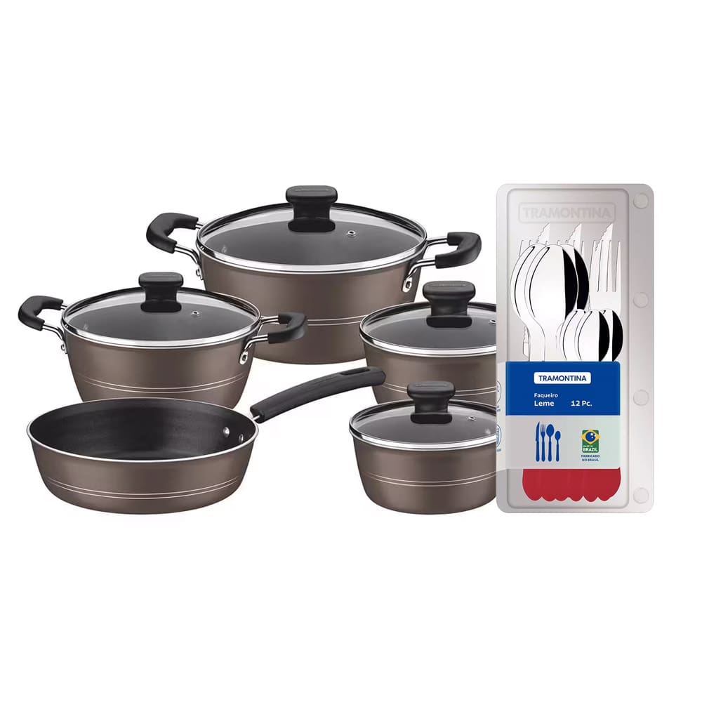 Conjunto de Panelas Tramontina Sicilia com Revestimento Starflon Excellent Avelã – 5 Peças + Faqueiro 12 Peças Tramontina Leme - Vermelho