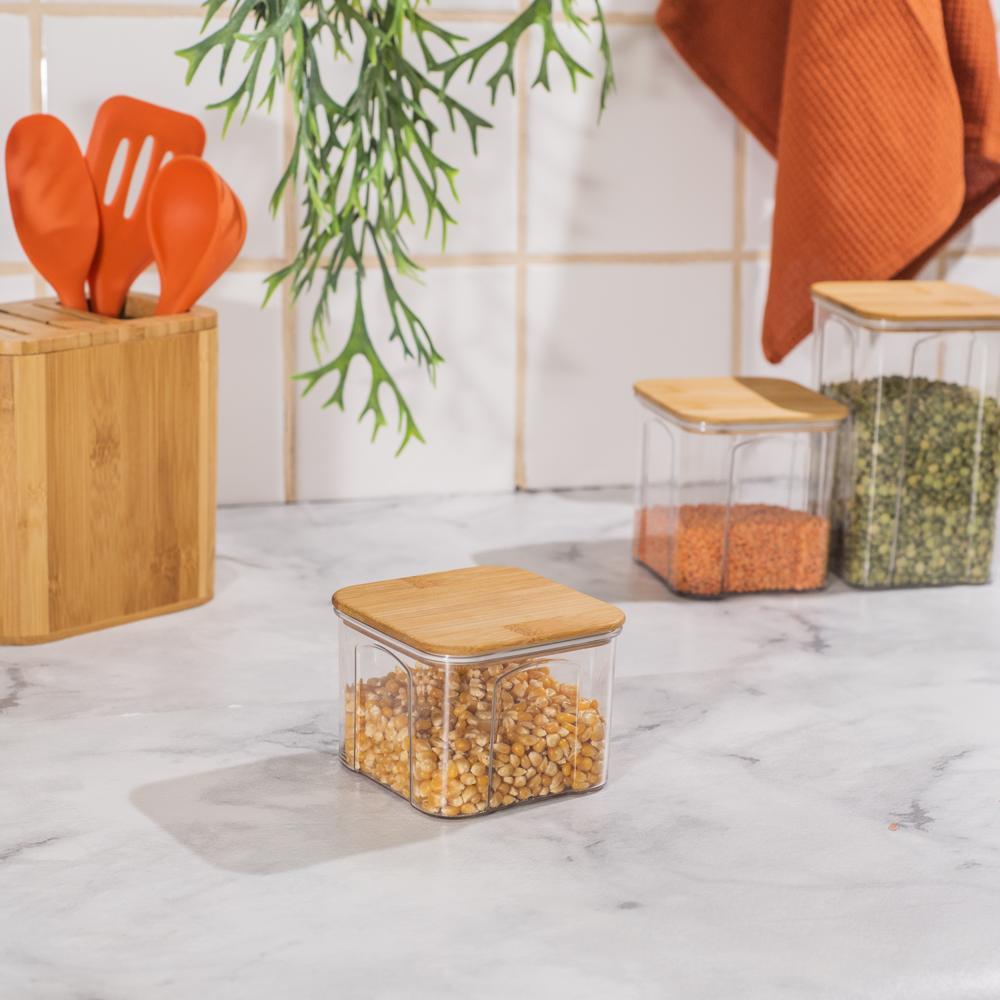 Pote 650Ml De Plástico Translúcido e Tampa De Bambu Quadrado
