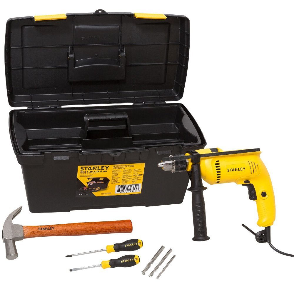 Kit Furadeira Impacto 600W 220V C/ 3 Brocas Concreto 2 Chaves Fenda Martelo Caixa Stanley