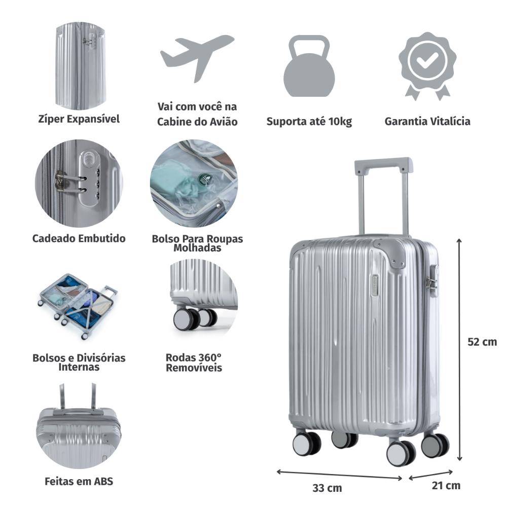 Tenha uma mala de bordo com design que une estilo e resistência. A Mala de Bordo Monte Carlo traz detalhes frisos em sua estrutura rígida que deixam a sua bagagem muito mais segura e aumentam a durabilidade da sua mala. Com alça de mão superior o modelo possui carrinho em alumínio embutido, deixando o produto mais leve. Além disso, possui 4 rodas duplas que possibilitam giro 360º. Internamente, ela é forrada e possui cintas elásticas que facilitam a organização da sua bagagem. No compartimento da sua tampa, é equipada com uma divisória e bolso telado, ambos com fecho em zíper. DIFERENCIAIS - Vai a bordo; - Design com detalhes frisos; - Estrutura rígida; - Alça de mão superior; - Carrinho em alumínio embutido; - 4 rodas duplas com giro 360º; - Forro em nylon; - Cintas elásticas com trava; - Divisória e bolso telado, ambos com fecho em zíper; - Amplo espaço interno. Ziper Expansível: Zíper Expansível O zíper expansível faz com que a mala de viagem ganhe alguns centímetros de espaço extra, perfeito para acomodar itens a mais. Rodas 360º: Rodas 360° As rodas com giro 360º facilitam o deslocamento da mala de viagem, fazendo com que ela possa ser conduzida em qualquer direção, sem precisar incliná-la e sem fazer esforço. Amplo espaço interno: Amplo compartimento Interno A mala de viagem conta com divisórias simples e elásticos com trava, ideais para manter seus itens no lugar. Além disso, ela possui amplo espaço interno. Cadeado com Senha:
