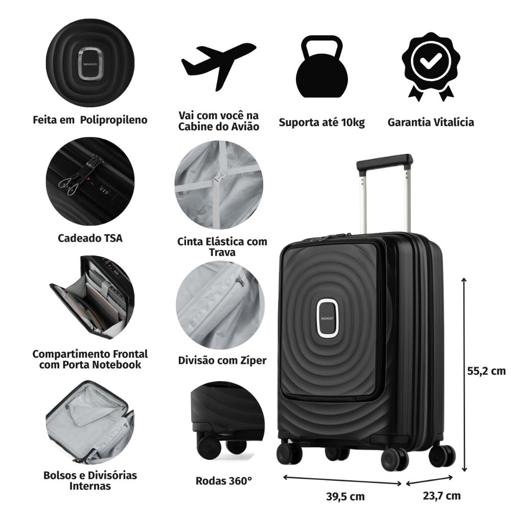 A nova Mala New York foi criada pensando em proporcionar estilo e praticidade nas suas viagens. Além do seu design elegante e moderno, é produzida em Polipropileno, material bastante resistente e super fácil de limpar. O modelo possui 4 rodas com giro de 360°, que facilitam a sua locomoção. Internamente, possui cintas elásticas e bolso com zíper, para lhe ajudar na organização de seus pertences. Para sua a maior segurança, esse modelo conta com cadeado fixo TSA, Ziper Antifurto Safeba, além de zíper resistente a água. DIFERENCIAIS: - 4 rodas com giro 360º; - 3 anos de garantia; - Cadeado TSA fixo; - 100% polipropileno, material extremamente resistente e durável - Porta notebook; - P conta com porta notebook; - P vai a bordo. Disponível nas cores: preto e verde.