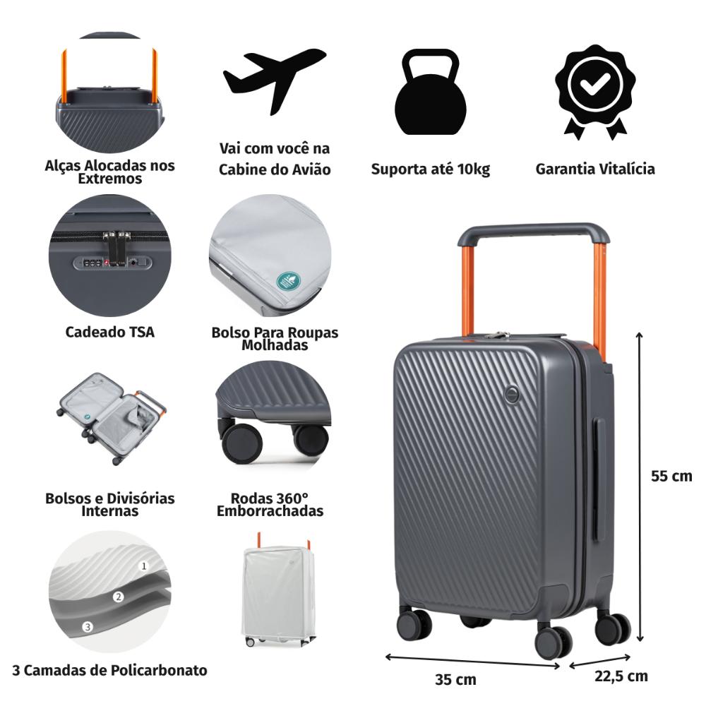 Mala Bahamas - Mala de Bordo Chegou a mala dos sonhos para quem busca excelência. A mala Bahamas foi criada para ser a melhor opção para suas próximas viagens, construída com uma combinação de itens de alta qualidade fabricados por empresas referência no mercado. FEITA EM POLICARBONATO O modelo é construído com três camadas de policarbonato da empresa alemã Bayer. Hoje, o policarbonato é o melhor material utilizado na construção de malas em todo o mundo, sendo altamente resistente, durável e leve. ZÍPER E RODAS DE REFERÊNCIA A mala conta com zíper da japonesa YKK, que tem cinco camadas de reforço para você não se preocupar se precisar “forçar” a mala com mais bagagem. São também mais suaves de usar. Já as rodas foram desenvolvidas pela empresa americana SJ. Tobol, com material de alta precisão. Elas são perfeitas para qualquer tipo de chão e estrada, possuem giro 360º e são silenciosas. ALÇA TELESCÓPICA E MAIS ESPAÇO INTERNO As alças principais são alocadas nos extremos da mala, para proporcionar mais espaço interno para sua bagagem. Além disso, são telescópicas, feias em alumínio resistente, antiferrugem e durável, com diferentes ajustes de tamanho para se encaixar à sua necessidade. O material interno é antibactericida de longa duração e pode eliminar até 99% das bactérias mais comuns. Ele não suja nos cantos e evita manchas no forro. ESPAÇO PARA ROUPA MOLHADA O espaço interno conta com compartimento de EVA para roupa molhada, além de diversos compartimentos para melhor organização da sua bagagem. DIFERENCIAIS: - 3 camadas de policarbonato da Bayer - Zíper com 5 camadas de reforço da empresa japonesa YKK - Rodas dupla silenciosas que giram 360º da empresa americana SJ. Tobol - Cadeado TSA - Alças alocadas nos extremos da mala, para mais espaço interno