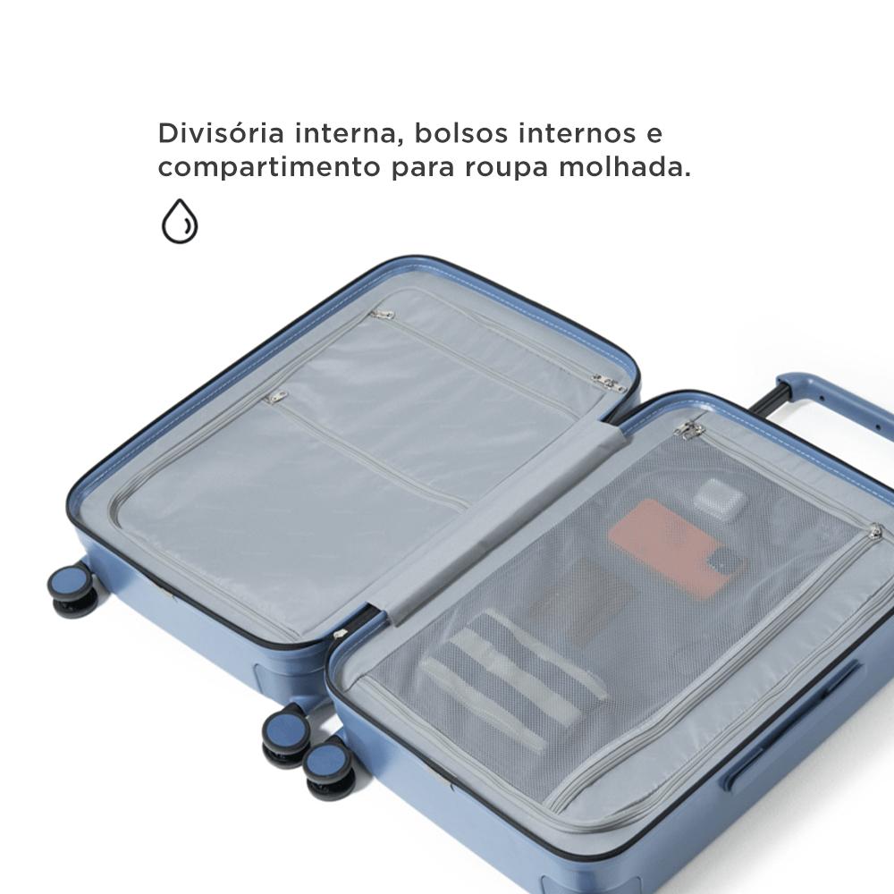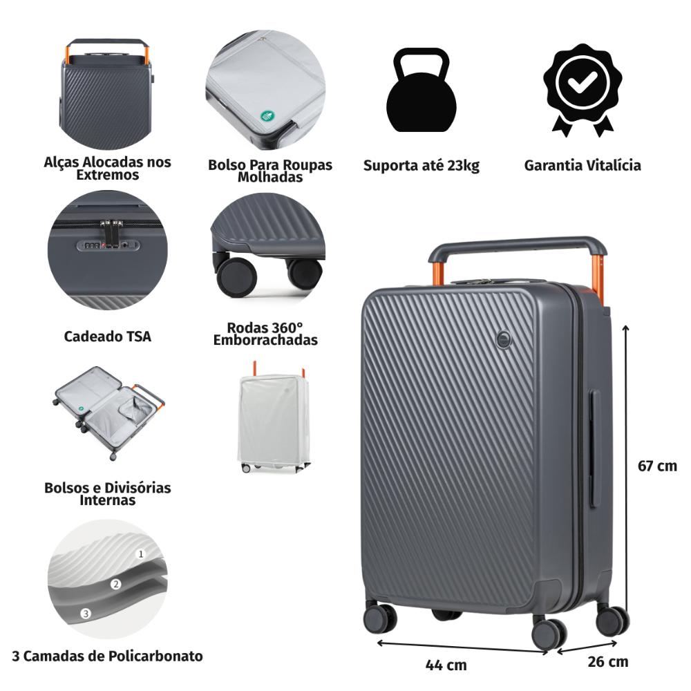 Mala Bahamas - Mala Média Chegou a mala dos sonhos para quem busca excelência. A mala Bahamas foi criada para ser a melhor opção para suas próximas viagens, construída com uma combinação de itens de alta qualidade fabricados por empresas referência no mercado. FEITA EM POLICARBONATO O modelo é construído com três camadas de policarbonato da empresa alemã Bayer. O policarbonato é o melhor material utilizado na construção de malas em todo o mundo, sendo altamente resistente, durável e leve. ZÍPER E RODAS DE REFERÊNCIA A mala conta com zíper da japonesa YKK, que tem cinco camadas de reforço para você não se preocupar se precisar “forçar” a mala com mais bagagem. São também mais suaves de usar. Já as rodas foram desenvolvidas pela empresa americana SJ. Tobol, com material de alta precisão. Elas são perfeitas para qualquer tipo de chão e estrada, possuem giro 360º e são silenciosas. ALÇA TELESCÓPICA E MAIS ESPAÇO INTERNO As alças principais são alocadas nos extremos da mala, para proporcionar mais espaço interno para sua bagagem. Além disso, são telescópicas, feias em alumínio resistente, antiferrugem e durável, com diferentes ajustes de tamanho para se encaixar à sua necessidade. O material interno é antibactericida de longa duração e pode eliminar até 99% das bactérias mais comuns. Ele não suja nos cantos e evita manchas no forro. ESPAÇO PARA ROUPA MOLHADA O espaço interno conta com compartimento de EVA para roupa molhada, além de diversos compartimentos para melhor organização da sua bagagem. DIFERENCIAIS: - 3 camadas de policarbonato da Bayer - Zíper com 5 camadas de reforço da empresa japonesa YKK - Rodas dupla silenciosas que giram 360º da empresa americana SJ. Tobol - Cadeado TSA - Alças alocadas nos extremos da mala, para mais espaço interno - Alça telescópica de alumínio resistente e antiferrugem - Alças duplas emborrachadas - Compartimentos internos - Bolso no interior para roupa molhada - Material interno antibactericida Cadeado TSA: Possui cadeado TSA para proteger sua bagagem em voos internacionais. Eles possuem abertura para uma chave universal, assim, a segurança do aeroporto consegue abrir o cadeado e inspecionar a bagagem sem precisar estourá-lo e danificar sua mala.